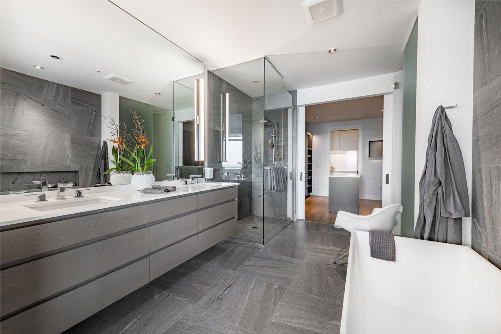 A high-end primary bathroom:
